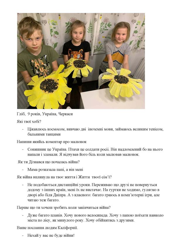 What are your hobbies? - I am interested in astronomy. I study two foreign languages. I play tennis & enjoy ballroom dancing. What would you like to share about the picture that you draw? - Sunflower is a symbol of Ukraine. Birds are soldiers of russia. The sunflower is broken because it was attacked. I felt its pain when I was drawing it. How did you find out that the war started? - Mom told Dad, and he told me. How has the war affected your life and the lives of your family? - I don't like distance lessons. I worry my friends will not return home from other countries; I miss them. We do not go to after school clubs. We go for walk in our backyard and sometimes near the Dniper river. I read when I am not playing games on my phone. The first thing you want to do when the war is over? - I have so many dreams. I want a new bike. I want to drive around the city through the forest with my Dad, like we did last year. I want to hug my friends. Your message to the people of California. - May you never experience the war!